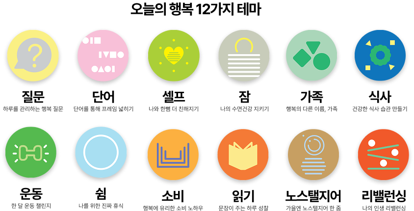 오늘의 행복은 총 12개의 테마로 구성되어 있습니다.